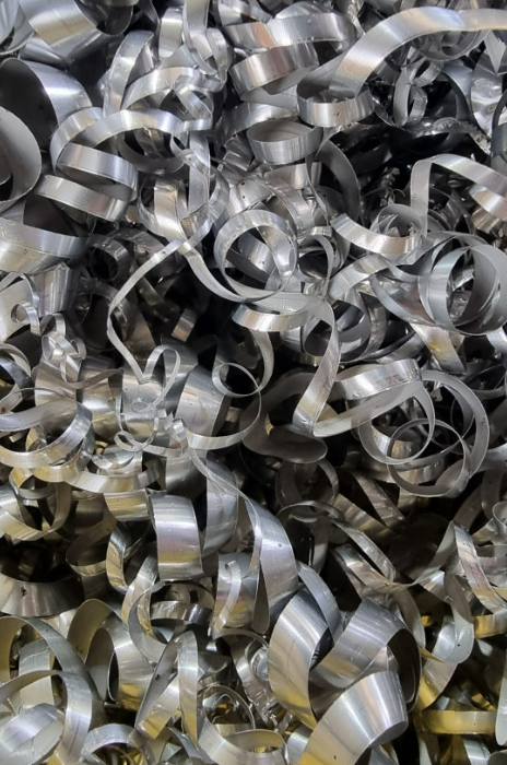 절삭 칩은 알루미늄 가공 공정에서 발생하는 얇고 길쭉한 형태의 스크랩으로 부드러운 질감을 갖고 있음.